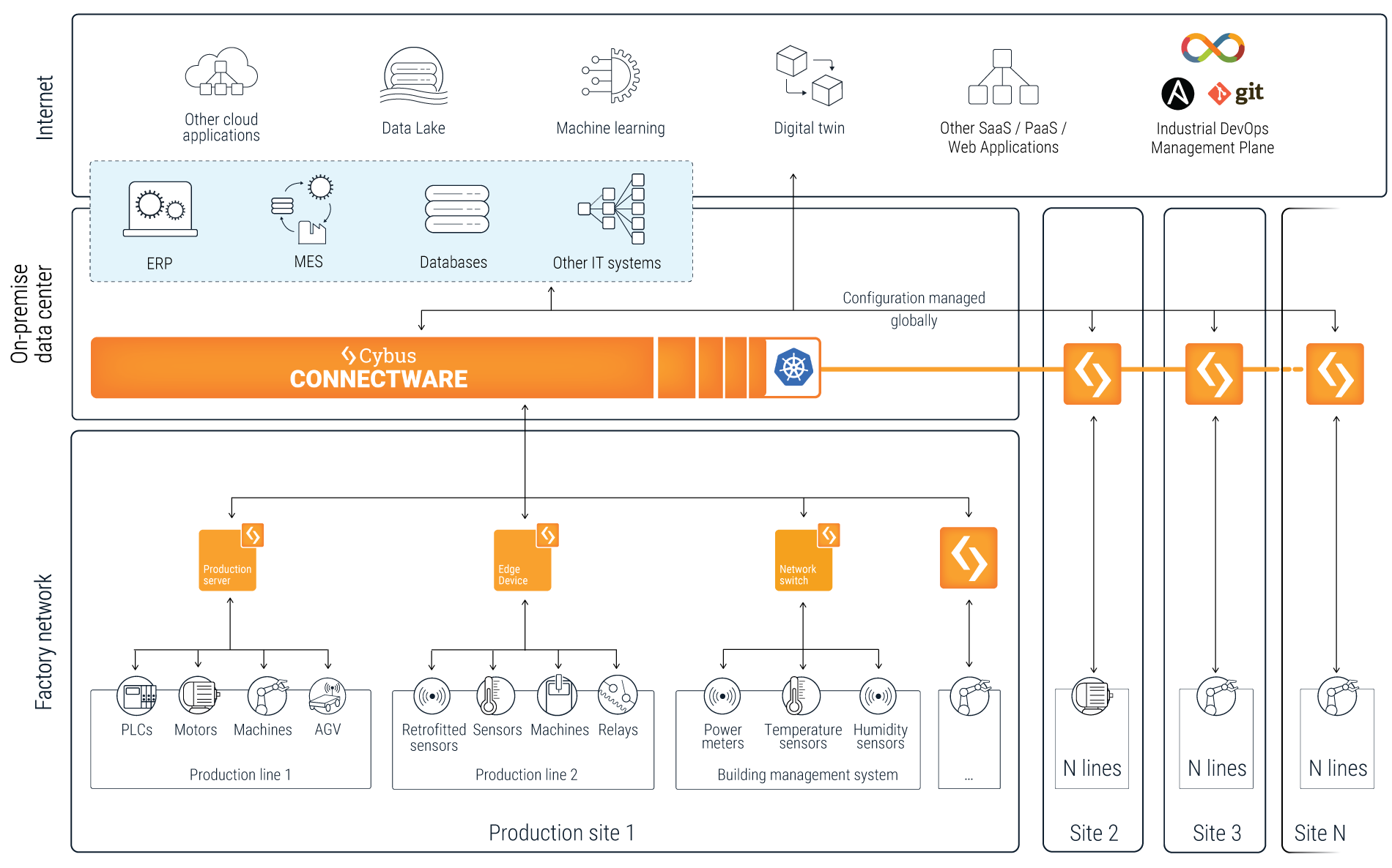 This architecture shows how Cybus Connectware operates as the Industrial Data Management between OT and IT – and how it fits into your existing factory set-up.